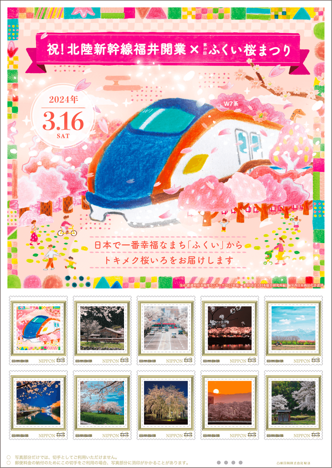 オリジナル フレーム切手セット「祝!北陸新幹線福井開業×第39回ふくい桜まつり」のイラストを制作。